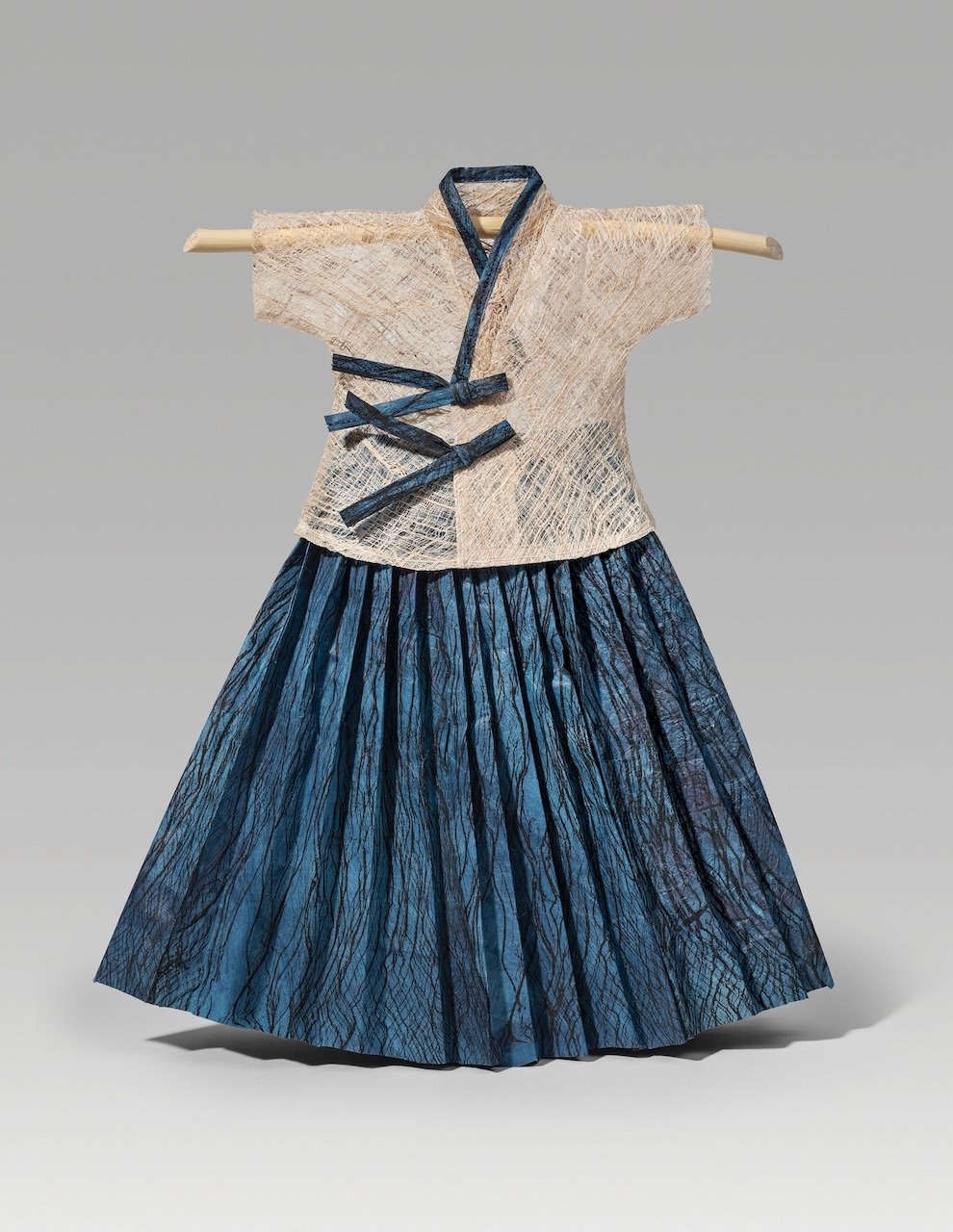Return (2025). Mulberry bark lace, ink and indigo on hanji, thread. 13.75 x 12 x 2”.